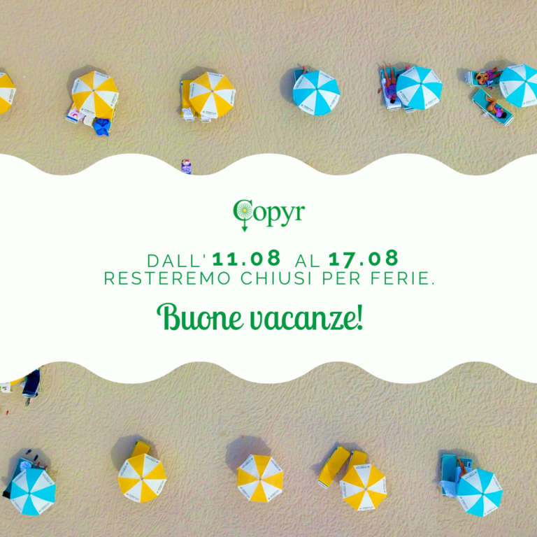 In occasione delle ferie estive 2022, i nostri uffici rimarranno chiusi dal 11/08/2022 al 17/08/2022 compresi. Per garantire la consegna prima della chiusura, è necessario