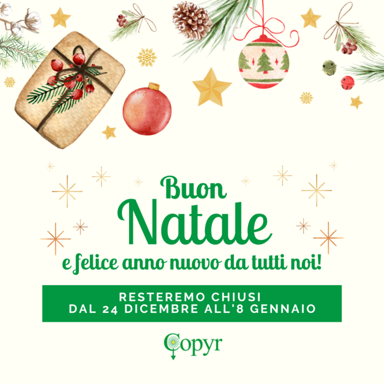 In occasione delle festività natalizie i nostri uffici rimarranno chiusi dal 24/12/2022 al 06/01/2022 compresi. L’azienda riaprirà il 9 gennaio. Per garantire la consegna prima della chiusura,