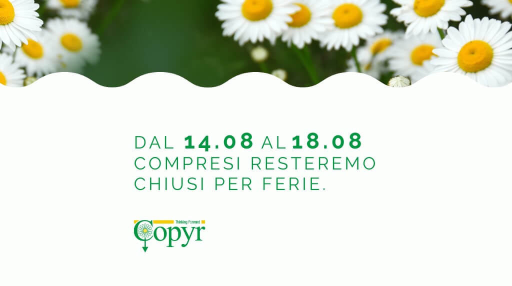 In occasione delle ferie estive 2023, i nostri uffici rimarranno chiusi dal 14/08/2023 al 18/08/2022 compresi.