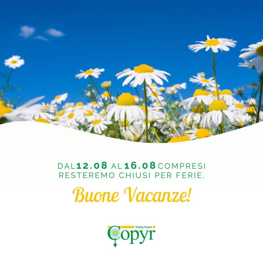 In occasione delle ferie estive 2024, i nostri uffici rimarranno chiusi dal 12/08/2024 al 16/08/2024 compresi.