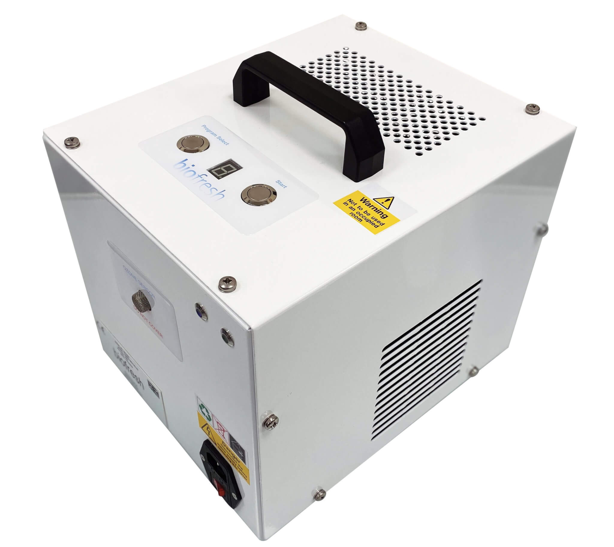 Portable ozone unit for air treatment Portable ozone unit with an integrated oxygen conversion system. Can be controlled using remote control from a device equipped with wi-fi. Easily transportable and can be used to sanitise small and medium sized rooms. It is equipped with 8 programmes with cycles from 15 minutes to 24 hours, which produce 4 gr/h of ozone, and in each of these programmes there is a reconversion cycle. Mini Cubo Deluxe has the same characteristics as the Mini Cubo and is equipped with a safety sensor that activates the ozone conversion process until the safety limits are reached. It can also be managed via wifi from smartphones or tablets.