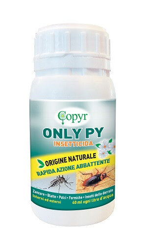 ONLY PY is a concentrated emulsifiable liquid insecticide based solely on Pyrethrins, an active substance of natural origin. ONLY PY is characterised by a strong knockdown effect and therefore a high speed of action against crawling insects (cockroaches and ants), flying insects (flies and mosquitoes, including the tiger mosquito) and food insects. The characteristics of Pyrethrins also allow it to be used in sensitive areas such as schools, hospitals, green areas and food industries. ONLY PY is effective against: