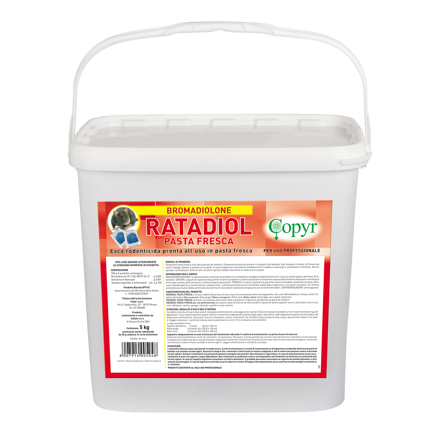 RATADIOL FRESH PASTE is a ready-to-use rodenticidal bait based on an anticoagulant active substance, called Bromadiolone, effective against house mice (Mus musculus), common rats (Rattus norvegicus) and black rats (Rattus rattus), even after a single ingestion. The formulation consists of a fresh paste that is palatable to the indicated rodent species. The product does not alert or arouse suspicion in other rodent populations. RATADIOL FRESH PASTE contains a bitter substance to prevent accidental ingestion by children. RATADIOL FRESH PASTE can be used in and around industrial buildings (including warehouses, stores, ship holds), rural, civil and residential buildings, cellars, garages, storage rooms, gardens and outdoor areas.