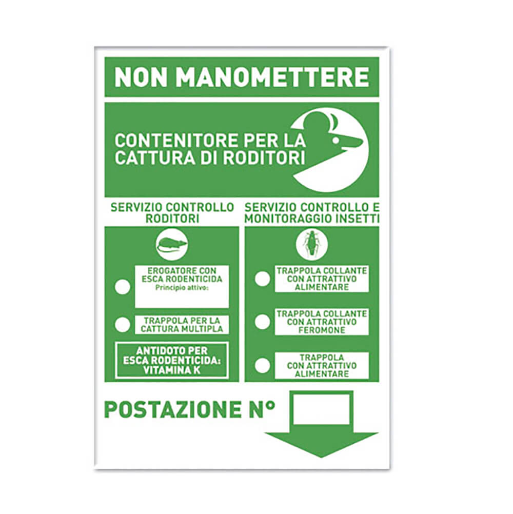 Bait-warning signs with an adhesive layer on the back for rodent control and monitoring services. For indoor and outdoor use. Rain resistant.