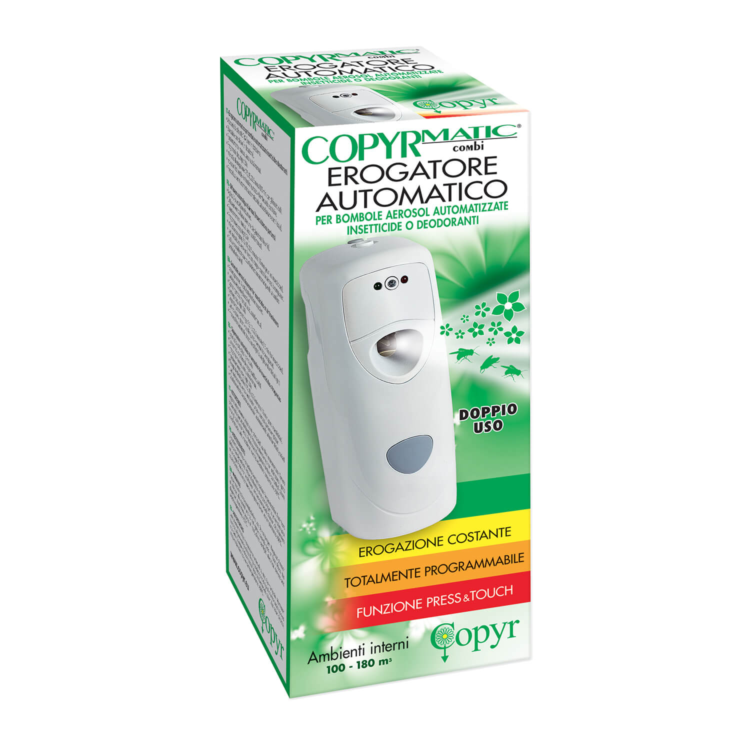 El aparato acciona los aerosoles especiales, que vienen con válvula dosificadora, para dispensar una cantidad de producto establecida de antemano (insecticida, desodorante o neutralizador de olores). Al propagarse por el local, el producto controla las plagas de insectos voladores creando barrera eficaz contra las reinfestaciones, desodoriza el espacio o bien neutraliza los olores desagradables.