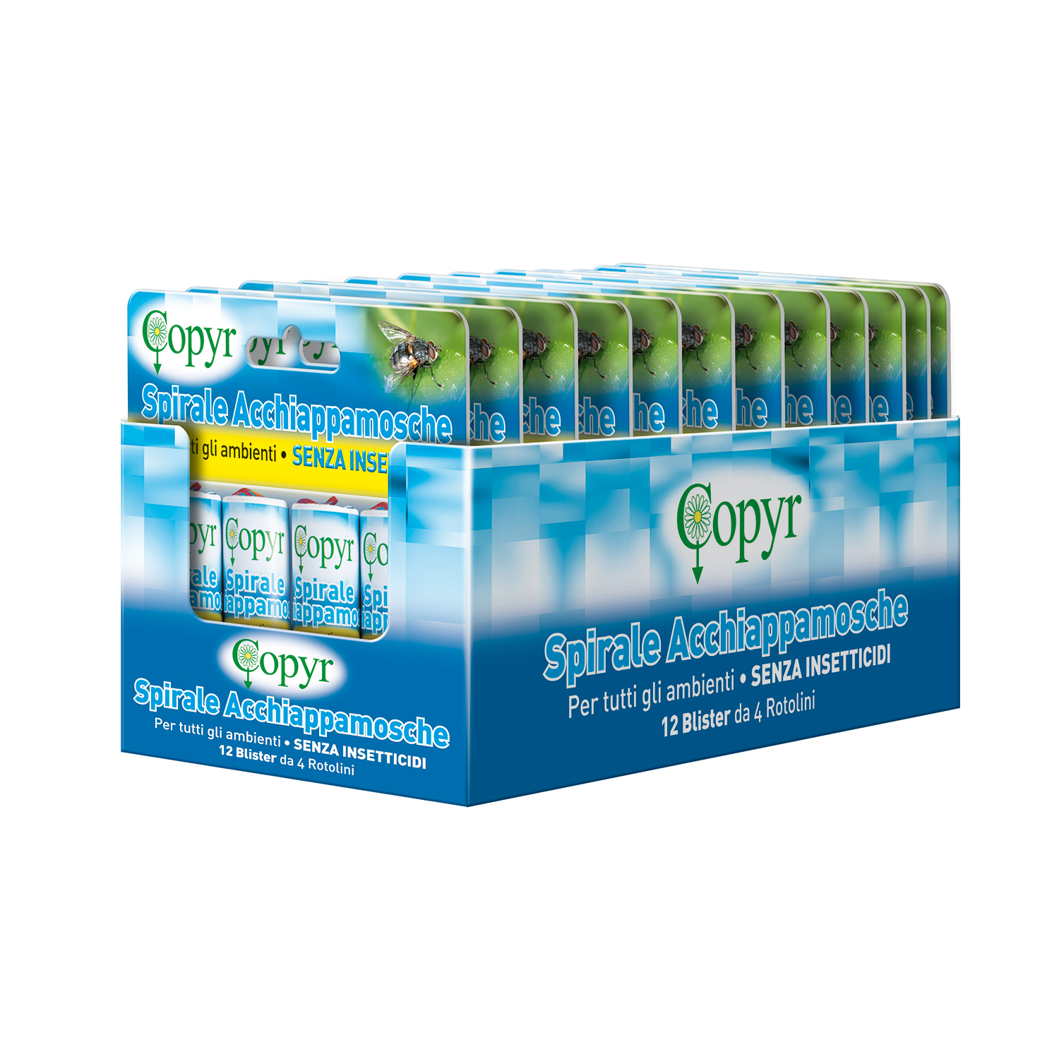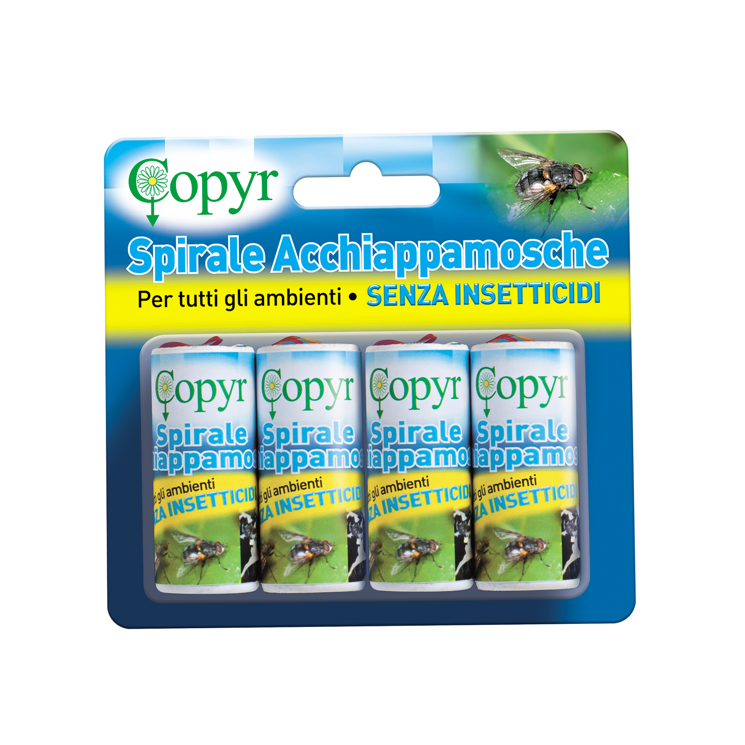 Spirale Acchiappamosche es un producto listo para usar, que consta de una espiral adhesiva biológica, que se estudió para atrapar y controlar las moscas y otros insectos voladores. Su cinta viscosa no contiene insecticidas. Se puede usar en todos los entornos interiores y exteriores, viviendas incluidas.