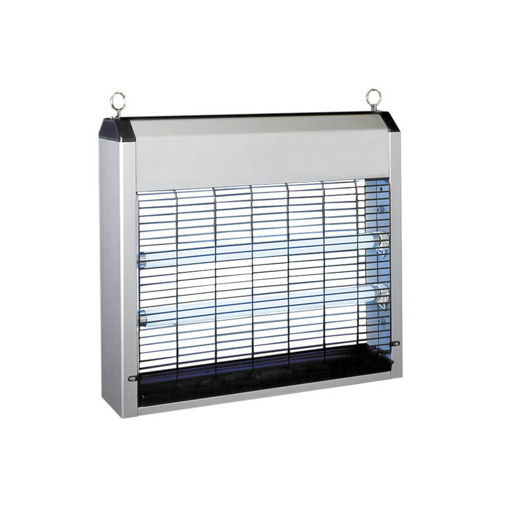 Trampa electroluminosa doble faz, con un radio de protección de aproximadamente 250-300 m2. Es de aluminio. Cuélguela del techo para capturar los insectos mediante el cartón con pegamento doble, que está ubicado en medio de las 4 lámparas UV.Espacios de uso: Ilugares públicos, hoteles, bares, restaurantes, gimnasios, cuarteles, establecimientos industriales en general y la industria alimentaria.