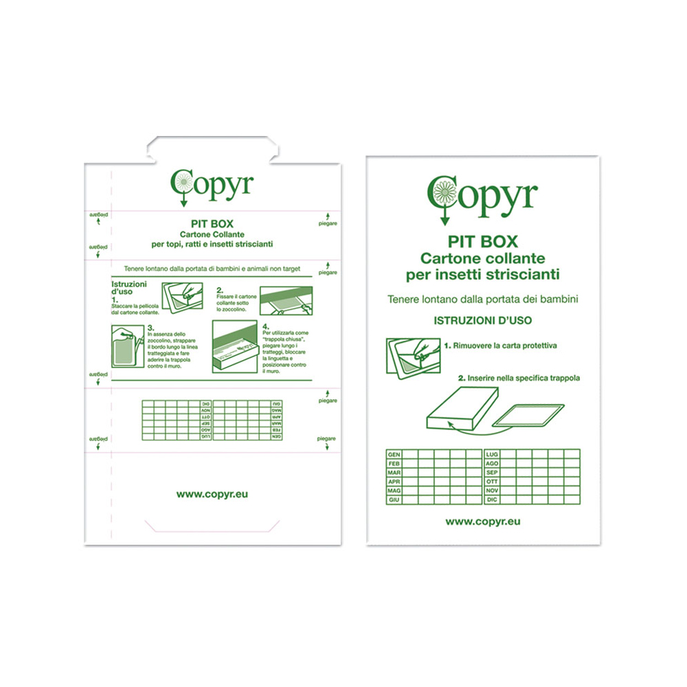 Trampa de plástico, conforme a todas las reglas de seguridad e higiene, que desempeña dos funciones: en la parte superior, un cartón con pegamento permite monitorizar y cazar ratones y ratas, mientras que en el cajón inferior se puede colocar un cartón con pegamento ad hoc, para monitorizar insectos rastreros. Es posible introducir una cuba para cebos rodenticidas. Consta de cerradura con llave de seguridad.