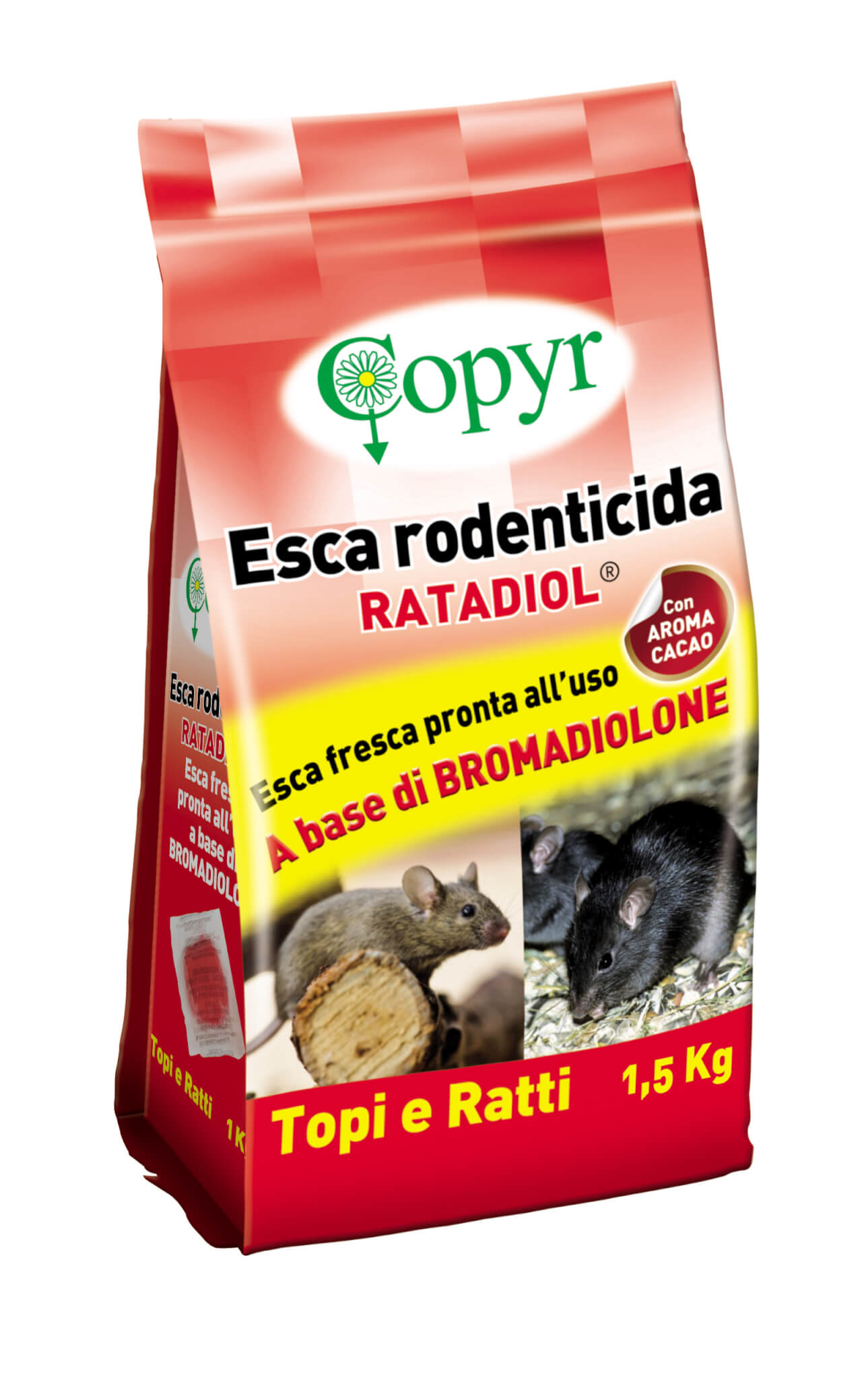 RATADIOL PASTA FRESCA es un cebo rodenticida, listo para usar, a base de Bromadiolone, una sustancia activa anticoagulante, que resulta efectiva contra el ratón común o doméstico (Mus musculus), la rata de alcantarilla (Rattus norvegicus) y la rata negra (Rattus rattus), incluso después de una única ingesta. La formulación consiste en una pasta fresca apetitosa para las especies de roedores indicadas. El producto no alarma ni suscita sospechas entre los otros miembros de la población de roedores. RATADIOL PASTA FRESCA contiene una sustancia amarga idónea para prevenir la ingestión accidental por parte de los niños. RATADIOL PASTA FRESCA se puede usar en el interior y alrededor de edificios industriales (incluidos almacenes, depósitos y bodegas de los barcos), rurales, no industriales, viviendas, sótanos, garajes, trasteros, jardines y espacios exteriores pertinentes.