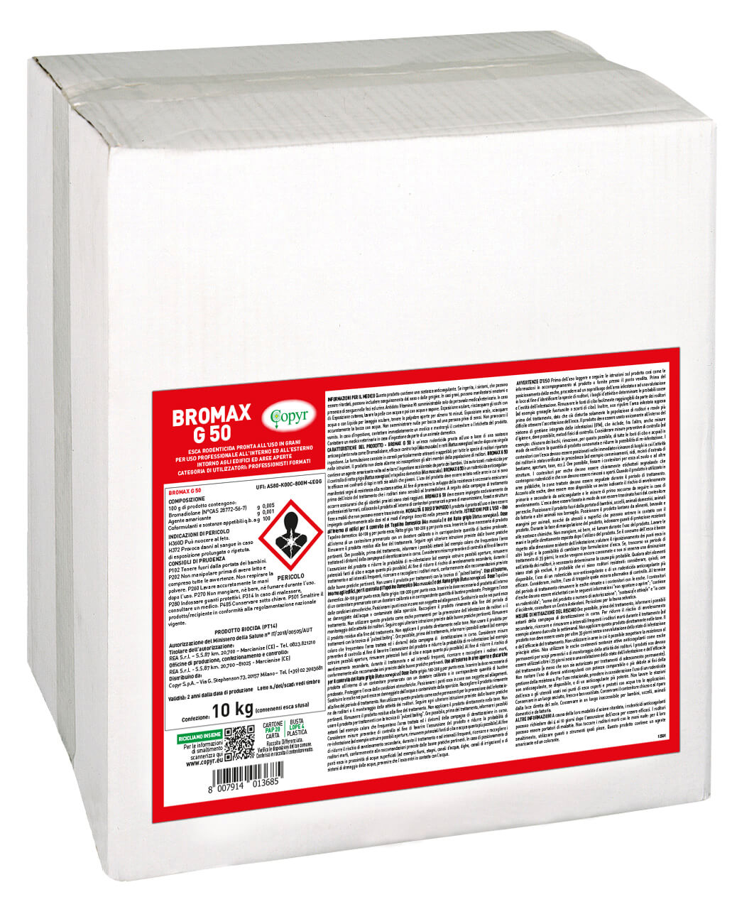 BROMAX G 50 deve essere impiegato esclusivamente da professionisti formati, collocando il prodotto all’interno di contenitori premarcati a prova di manomissione, fissati a strutture fisse o mobili che non possano essere trascinate via.