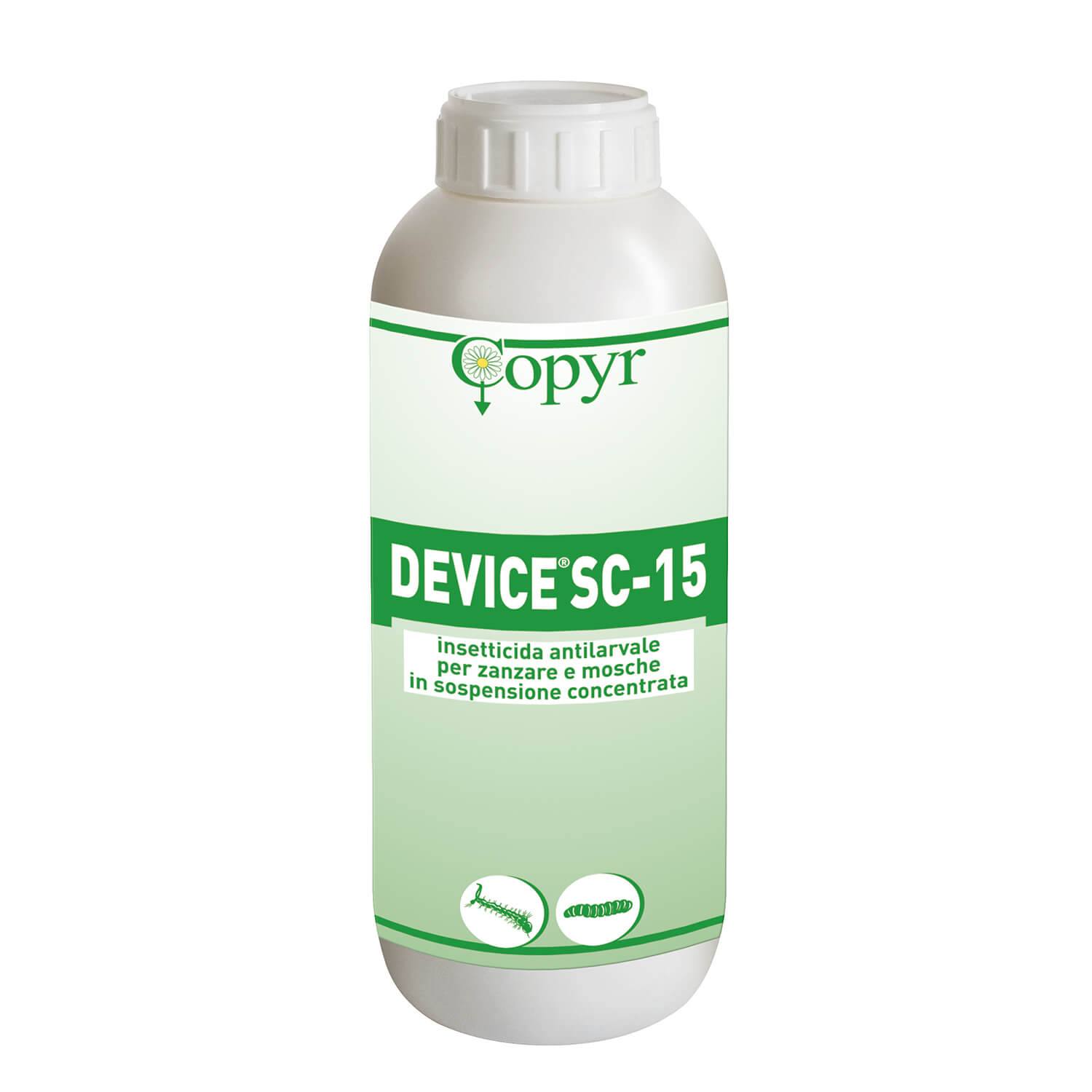 DEVICE® SC-15 agisce per ingestione e contatto contro le larve di zanzare e di mosche. DEVICE® SC-15 interferisce con la formazione di chitina nella cuticola delle larve di zanzare e delle mosche bloccandone il normale processo di muta. Gli effetti dell’applicazione del DEVICE® SC-15 sulle larve di zanzare e mosche sono visibili dopo 2 - 4 giorni.