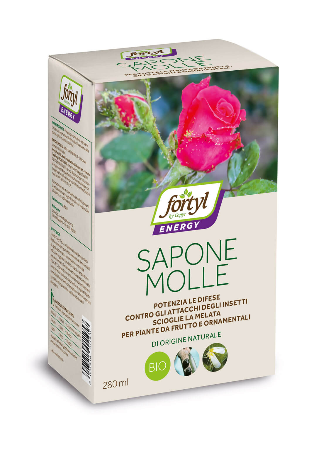 FORTYL ENERGY SAPONE MOLLE deriva dalla saponificazione di oli vegetali e non lascia residui sulla vegetazione. È un potenziatore delle difese della pianta nei confronti di insetti (es. afidi, aleurodidi, cocciniglie, cicaline, acari) e sciogliendo la melata prodotta dagli insetti, esplica azione indiretta nei confronti delle fumaggini. È possibile usare il prodotto su orticole, piante da frutto e ornamentali, in qualsiasi fase del ciclo della pianta.