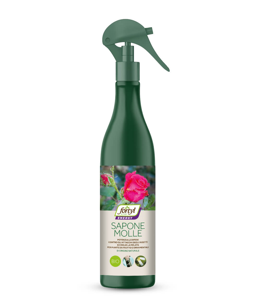 FORTYL ENERGY SAPONE MOLLE deriva dalla saponificazione di oli vegetali e non lascia residui sulla vegetazione. È un potenziatore delle difese della pianta nei confronti di insetti (es. afidi, aleurodidi, cocciniglie, cicaline, acari) e sciogliendo la melata prodotta dagli insetti, esplica azione indiretta nei confronti delle fumaggini.