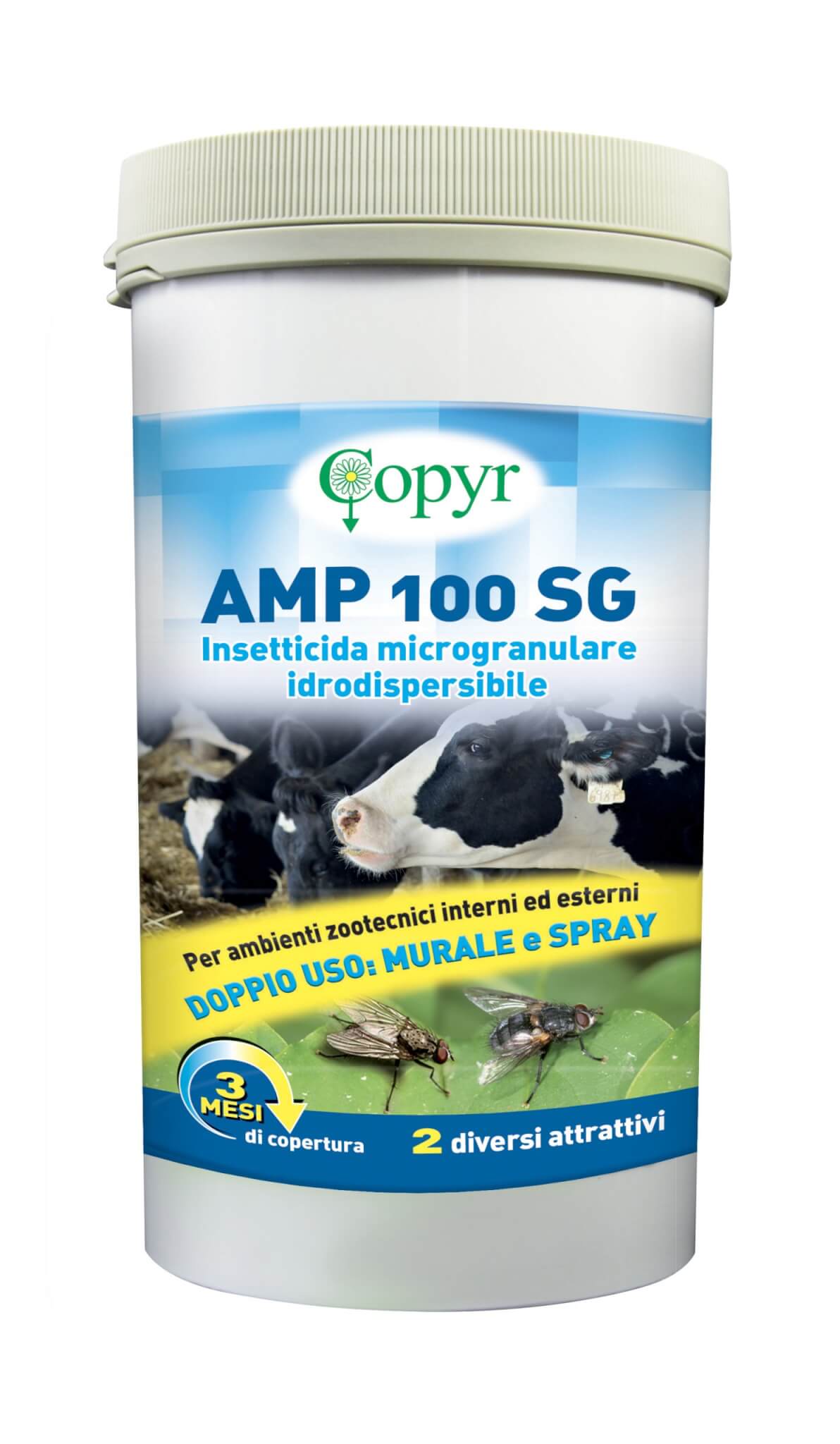 AMP 100 SG è un’esca insetticida formulata come microgranuli bagnabili per il controllo delle mosche con una durata d’azione che si protrae fino a 3 mesi. La presenza nella formulazione di due diversi attrattivi alimentari ed un ormone sessuale gli conferisce una molteplice capacità di attrarre i target. AMP 100 SG contiene Acetamiprid, neonicotinoide che agisce per contatto ed ingestione sul sistema nervoso centrale nell’area post-sinaptica. Le mosche, una volta entrate in contatto con il prodotto, smettono di alimentarsi e muoiono rapidamente. AMP 100 SG può essere applicato in due modi differenti: SPRAY o PITTURA MURALE