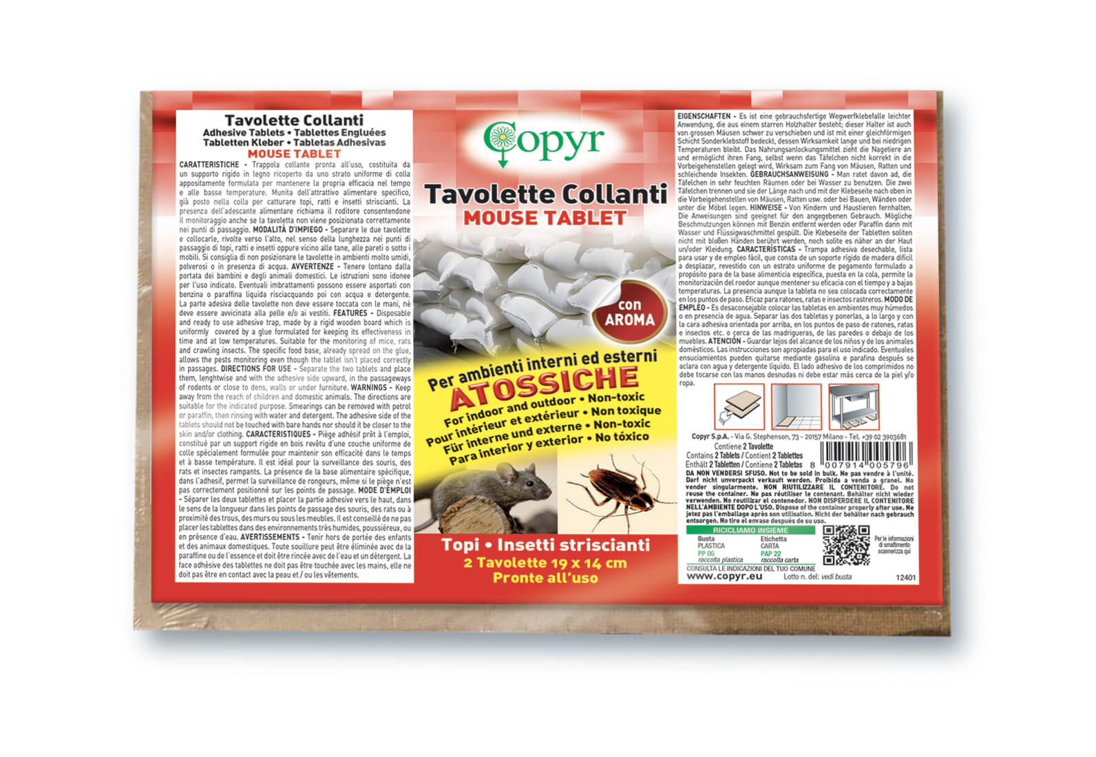 Trappola collante pronta all’uso, costituita da un supporto rigido in legno ricoperto da uno strato uniforme di colla appositamente formulata per mantenere la propria efficacia nel tempo e alle basse temperature. Munita dell’attrattivo alimentare specifico, già posto nella colla per catturare topi, ratti e insetti striscianti. La presenza dell’adescante alimentare richiama il roditore consentendone il monitoraggio anche se la tavoletta non viene posizionata correttamente nei punti di passaggio.
