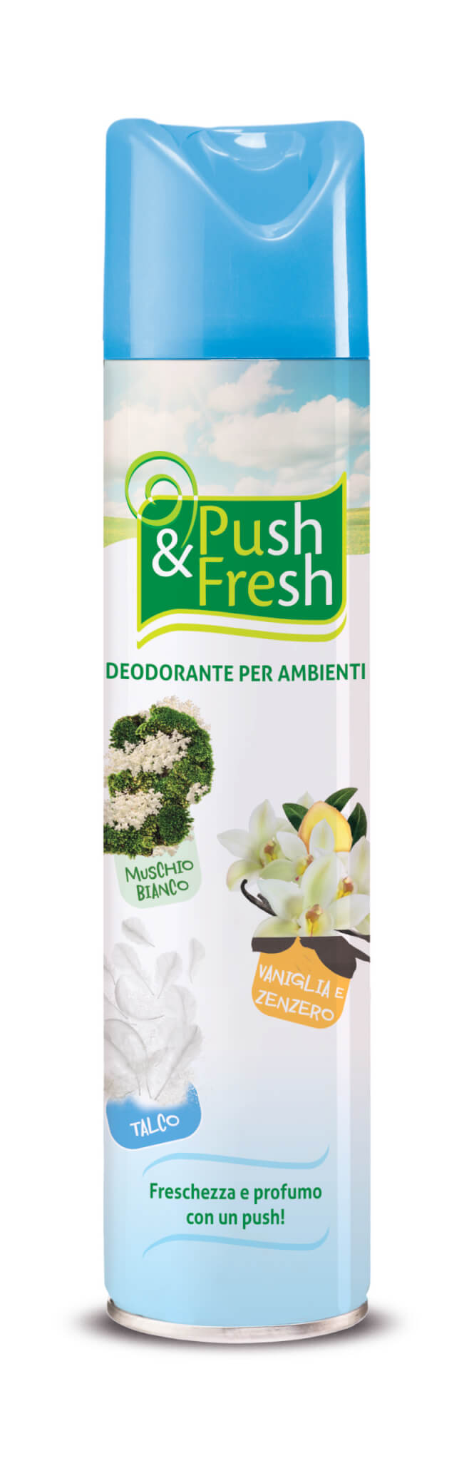 Push&fresh Talco permette di deodorare qualsiasi ambiente con un piacevole profumo. La profumazione "Talco" rinfresca e rilascia una sensazione di pulito nell'aria, creando le condizioni perfette per momenti di relax.