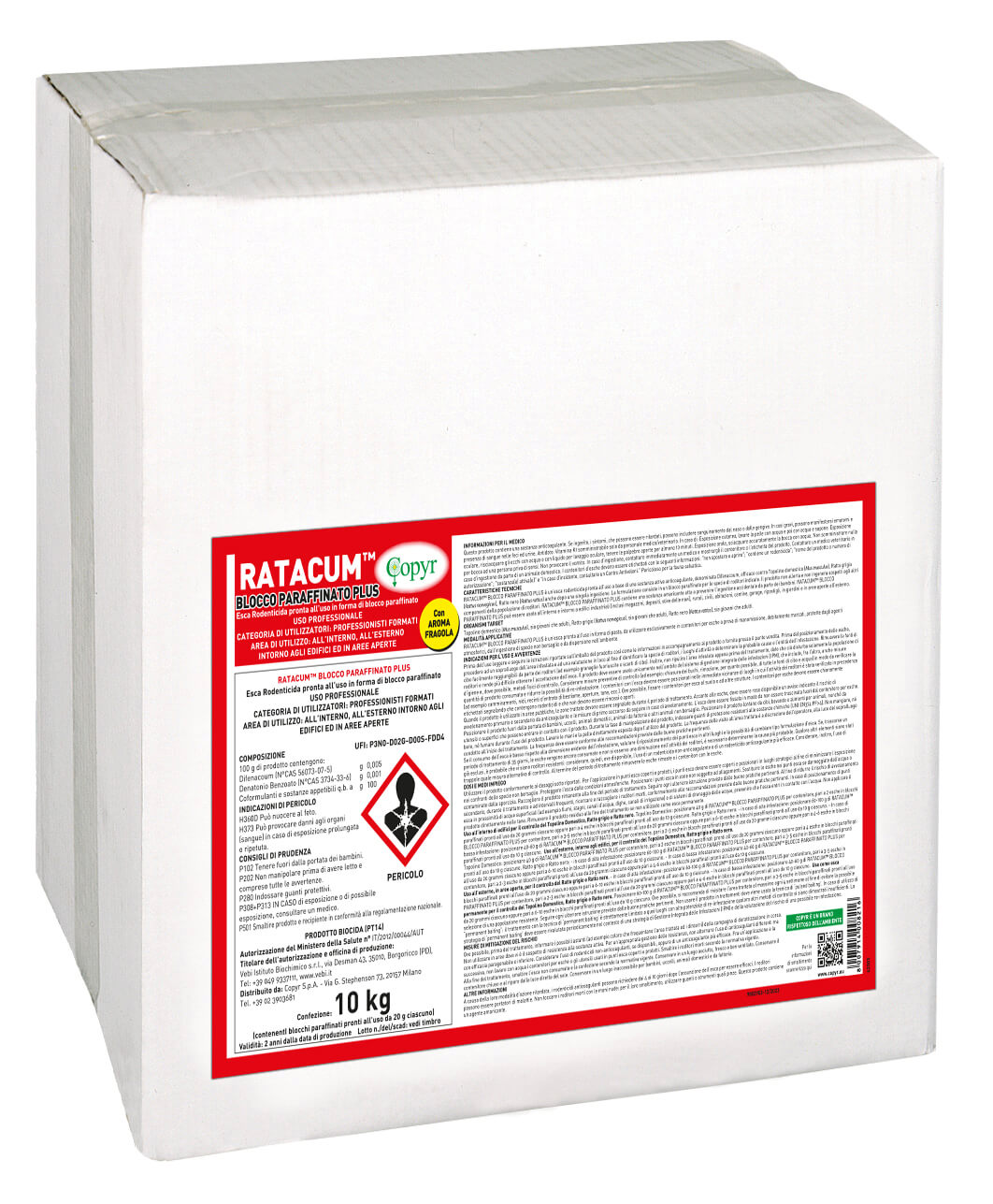 RATACUM™ BLOCCO PARAFFINATO PLUS è un’esca pronta all’uso in forma di pasta, da utilizzare esclusivamente in contenitori per esche a prova di manomissione, debitamente marcati, protette dagli agenti atmosferici, dall’ingestione di specie non bersaglio e da dispersione nell’ambiente.