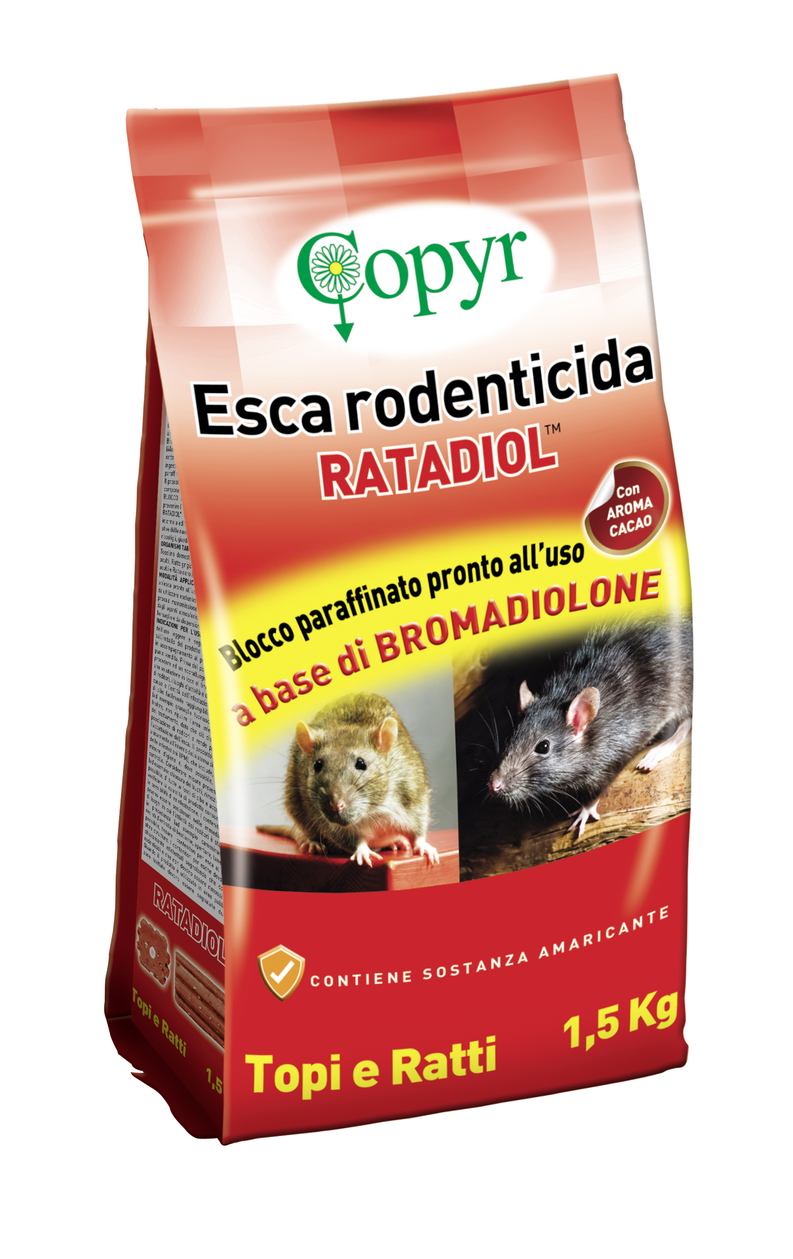 RATADIOL BLOCCO è un’esca rodenticida pronta all’uso a base di una sostanza attiva anticoagulante, denominata Bromadiolone, efficace contro Topolino domestico (Mus musculus), Ratto grigio (Rattus norvegicus) e ratto nero (Rattus rattus), anche dopo una singola ingestione. La formulazione consiste in un blocco paraffinato appetibile per le specie di roditori indicate. Il prodotto non allerta e non ingenera sospetti agli altri componenti della popolazione di roditori.