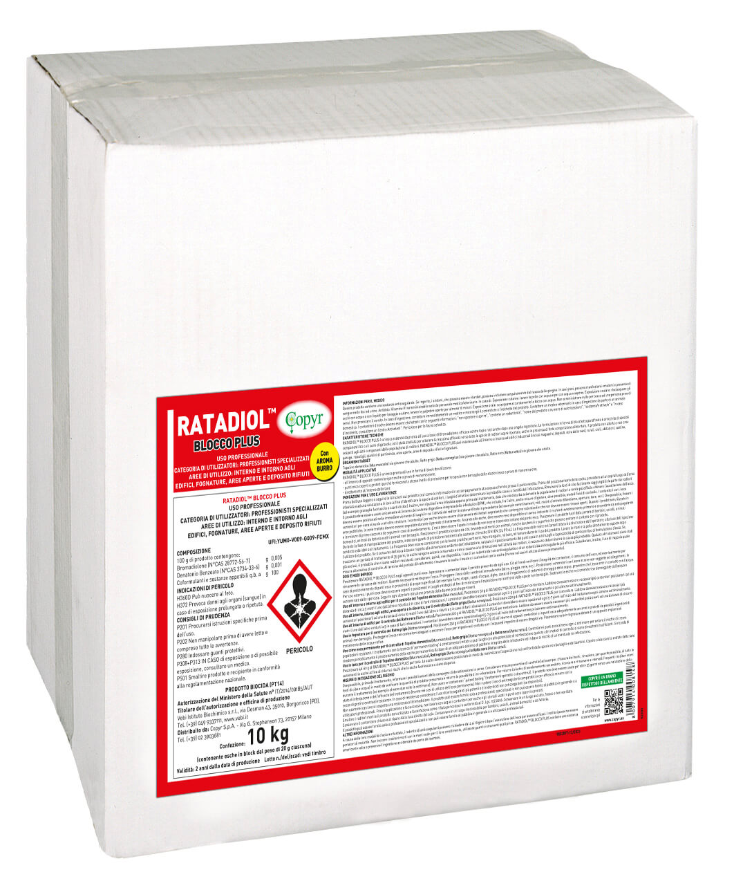 RATADIOL™ BLOCCO PLUS è un’esca rodenticida pronta all’uso a base di Bromadiolone, efficace contro topi e ratti anche dopo una singola ingestione. La formulazione in forma di blocchetto paraffinato è arricchita di speciali componenti tra cui i semi di girasole, ed è stata studiata per ottenere la massima efficacia verso tutte le specie di roditori sopra riportate, anche in presenza di forte competizione alimentare. Il prodotto non allerta e non crea sospetti agli altri componenti della popolazione di roditori. RATADIOL™ BLOCCO PLUS può essere usato all’interno e intorno ad edifici industriali (inclusi magazzini, depositi, stive delle navi), rurali, civili, abitazioni, cantine, garage, ripostigli, giardini di pertinenza, aree aperte, aree di deposito rifiuti e fognature.