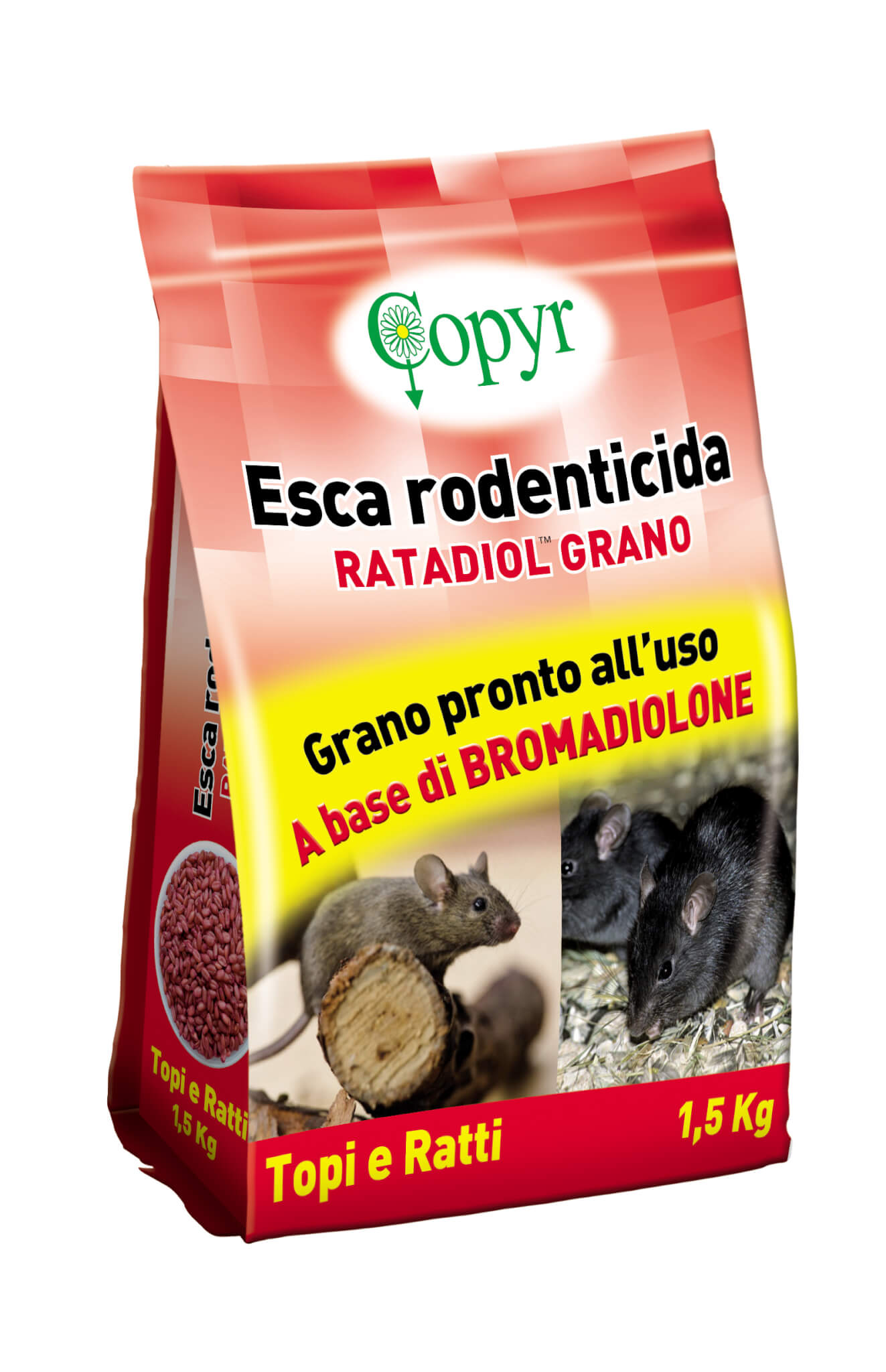 RATADIOL™ GRANO è un’esca rodenticida pronta all’uso a base di una sostanza attiva anticoagulante, denominata Bromadiolone, efficace contro Topolino domestico (Mus musculus), Ratto grigio (Rattus norvegicus), Ratto nero (Rattus rattus) anche dopo una singola ingestione. La particolare formulazione, appetibile soprattutto verso roditori già abituati ad alimentarsi con granaglie, è stata studiata per ottenere la massima efficacia verso tutte le specie di roditori riportate, anche in presenza di forte competizione alimentare. RATADIOL™ GRANO contiene una sostanza amaricante atta a prevenire l’ingestione accidentale da parte dei bambini. RATADIOL™ GRANO può essere usata all’interno e intorno ad edifici industriali (inclusi magazzini, depositi, stive delle navi), rurali, civili, abitazioni, cantine, garage, ripostigli, giardini.