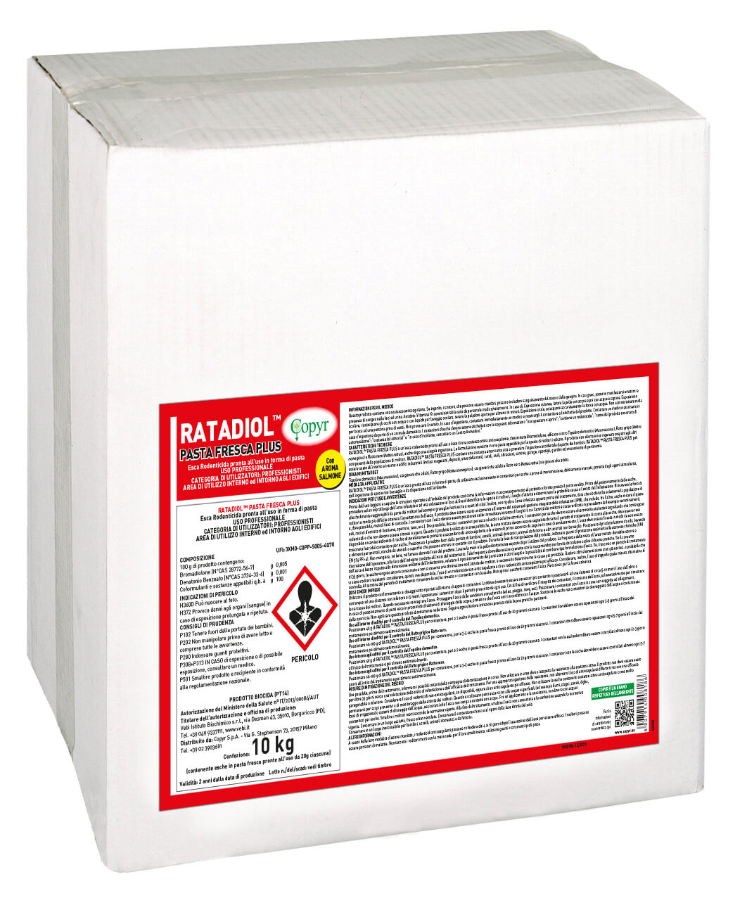 RATADIOL™ PASTA FRESCA PLUS è un’esca pronta all’uso in forma di pasta, da utilizzare in contenitori per esche a prova di manomissione o in punti esca coperti e protetti dagli agenti atmosferici, dall’ingestione di specie non bersaglio e da dispersione nell’ambiente.