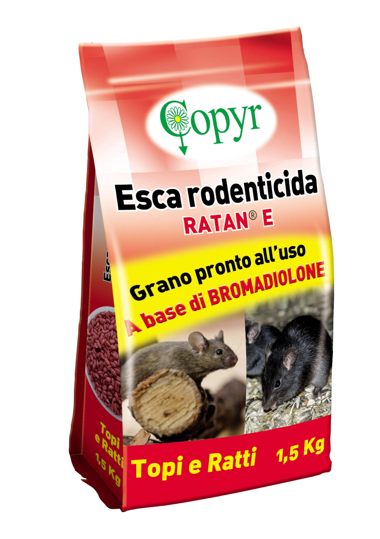 RATAN E GRANO è un’esca pronta all’uso a base di Bromadiolone e formulata in grano, efficace per il controllo di Topolino domestico (Mus musculus), Ratto grigio (Rattus norvegicus), Ratto nero (Rattus rattus), appetibile soprattutto per roditori già abituati ad alimentarsi con granaglie. L’ingestione di una quantità sufficiente di esca causa la morte di ogni roditore nel volgere di qualche giorno, senza creare allarme o destare sospetto negli altri componenti della colonia. Questo è possibile in virtù del meccanismo di azione degli anticoagulanti, che provocano emorragie interne letali.