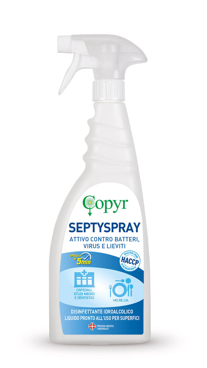 SEPTYSPRAY è un disinfettante idroalcolico pronto all’uso a base di Alchil (C12-16) dimetilbenzil ammonio cloruro ADBAC/BKC (C12-C16). Svolge un’efficace azione battericida ad ampio spettro (attivo contro i batteri GRAM+ e GRAM-), lieviticida e contro i virus con involucro. SEPTYSPRAY è indicato per una rapida ed efficace disinfezione di tutte le superfici dure ed attrezzature sia durante la vita di tutti i giorni sia in ambito sanitario che nel settore alimentare. Utile per i piani di autocontrollo HACCP.