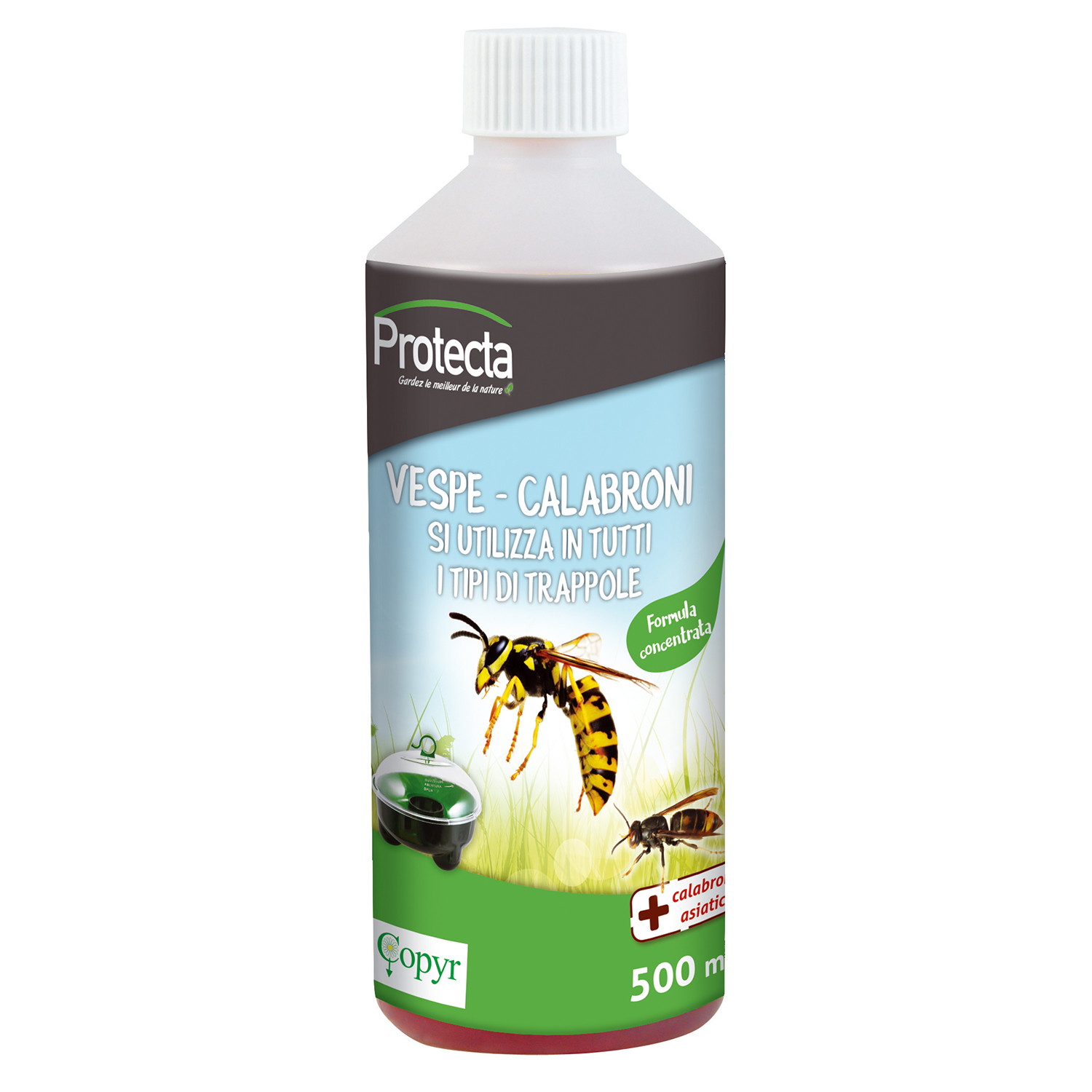 Attrattivo alimentare per VESPE e CALABRONI - Inodore ed ecologica - Agisce immediatamente a qualsiasi temperatura. - Attrae calabroni, vespe, mosche - Efficace per 10 - 12 giorni -Contiene un repellente che limita l’attrazione delle api e dei fuchi, tuttavia non posizionare la trappola a meno di 5 metri da un alveare