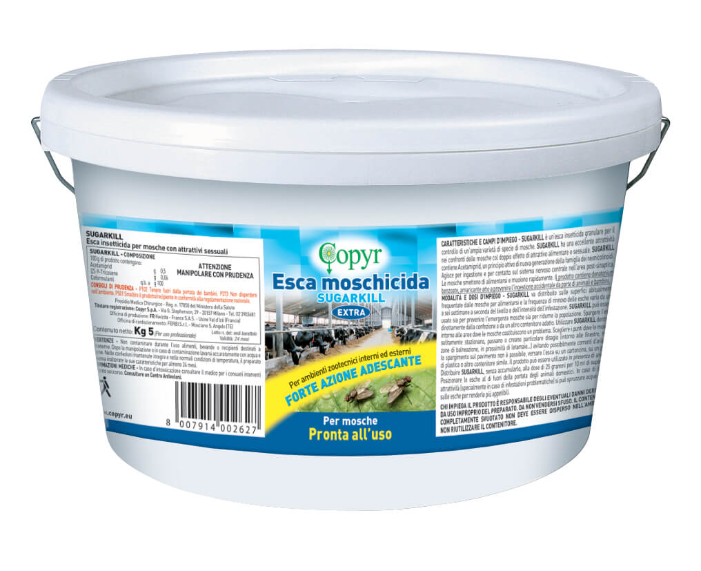 SUGARKILL è un’esca insetticida granulare per il controllo di un’ampia varietà di specie di mosche. SUGARKILL ha una eccellente attrattività nei confronti delle mosche col doppio effetto di attrattivo alimentare e sessuale. SUGARKILL contiene Acetamiprid, un principio attivo di nuova generazione della famiglia dei neonicotinoidi. Agisce per ingestione e per contatto sul sistema nervoso centrale nell’area post-sinaptica Le mosche smettono di alimentarsi e muoiono rapidamente. Il prodotto contiene denatonium benzoate, amaricante atto a prevenire l’ingestione accidentale da parte di animali e bambini.