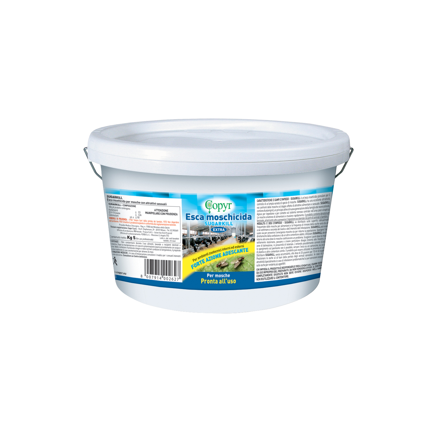 SUGARKILL è un’esca insetticida granulare per il controllo di un’ampia varietà di specie di mosche. SUGARKILL ha una eccellente attrattività nei confronti delle mosche col doppio effetto di attrattivo alimentare e sessuale. SUGARKILL contiene Acetamiprid, un principio attivo di nuova generazione della famiglia dei neonicotinoidi. Agisce per ingestione e per contatto sul sistema nervoso centrale nell’area post-sinaptica Le mosche smettono di alimentarsi e muoiono rapidamente. Il prodotto contiene denatonium benzoate, amaricante atto a prevenire l’ingestione accidentale da parte di animali e bambini.